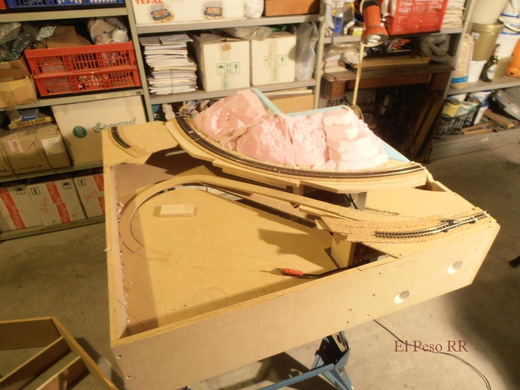 Oli started forming landscape on his corner module by cutting out some of the module sides and covering the rest with foam. This module will contain rail going over a fill with a culvert.