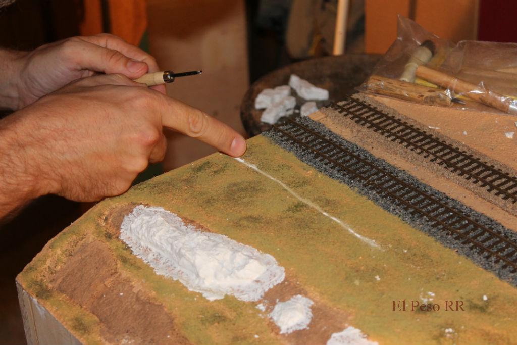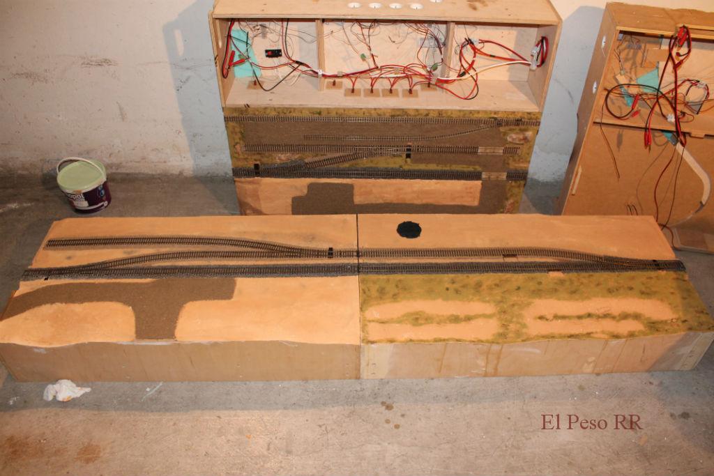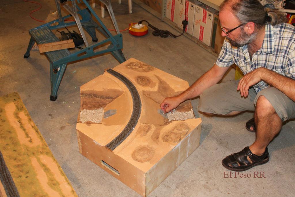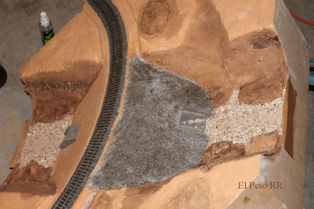 While Davor is on vacation Oli and Boki continued work on modules. We finished dry creek on Davors module. Oli started ground cover on his fill and Boki placed additional rocks on Olis station modules.